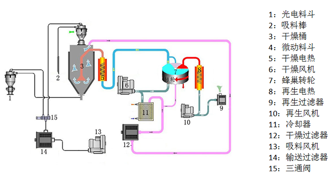 –、干燥除濕部分:從干燥料桶回來的濕熱空氣經冷卻,吹入蜂巢轉輪.空氣中的水分被轉輪吸附,然后又被再生加熱空氣所脫附.兩股氣流同時作用在轉輪上,并隨著轉輪的轉動,使得空氣中的水分連續不斷的被吸附又被再生空氣所脫附而排出,就形成穩定的低露點空氣,經加熱到塑膠的干燥溫度,吹入干燥料桶內,形成密循環,干燥原料.