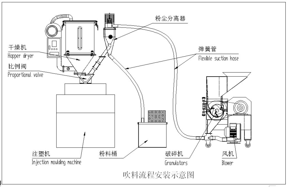 短時間的回收,避免污染,混料所造成的不良率,可減少塑料、人工、管理、倉儲,購料資金的浪費與損耗
