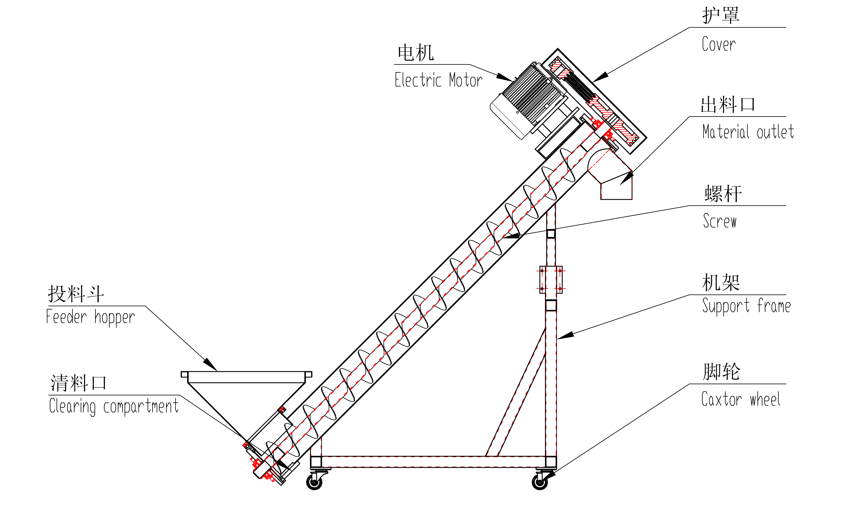螺桿式上料機(jī)根據(jù)螺旋旋轉(zhuǎn)時,由葉片的推動作用,同時在物料自身重力、物料與料管內(nèi)壁間的摩擦力以及物料的內(nèi)摩擦力的作用下,物料與螺旋葉片和料管相對滑動的形式,在料管內(nèi)向前移動的機(jī)械傳動原理設(shè)計的。可用于塑膠原料顆粒、粉塵料、礦砂等物料輸送;